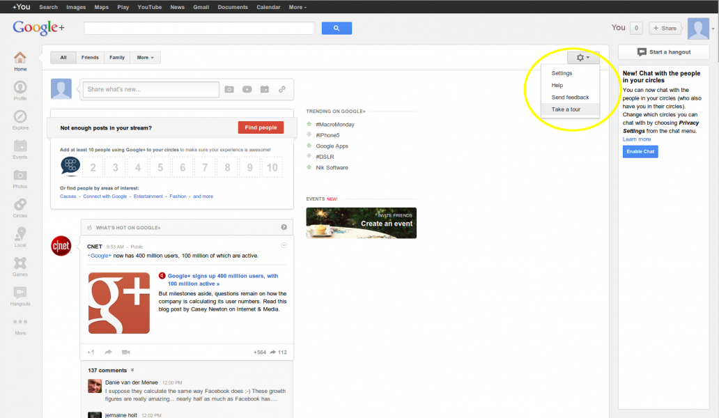Whenever you want to take the built-in Google+ tour, simply click on the gear icon near the top right of the page, and choose the "take a tour" option.